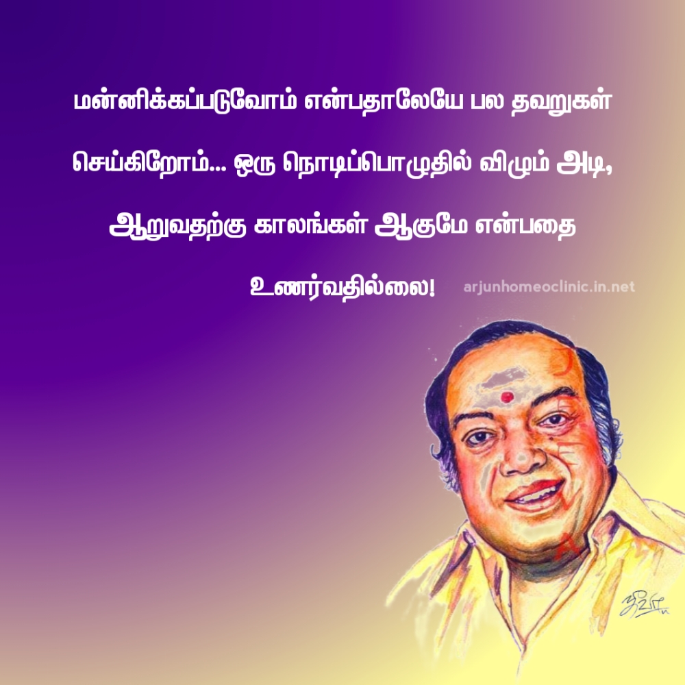 மன்னிக்கப்படுவோம் என்பதாலேயே பல தவறுகள் செய்கிறோம்... ஒரு நொடிப்பொழுதில் விழும் அடி, ஆறுவதற்கு காலங்கள் ஆகுமே என்பதை உணர்வதில்லை! - கவிஞர் கண்ணதாசன்