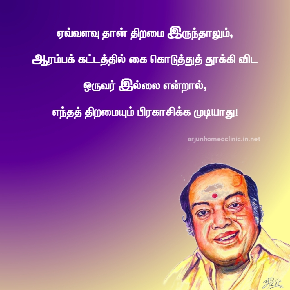 ஏவ்வளவு தான் திறமை இருந்தாலும், ஆரம்பக் கட்டத்தில் கை கொடுத்துத் தூக்கி விட ஒருவர் இல்லை என்றால், எந்தத் திறமையும் பிரகாசிக்க முடியாது! - கவியரசர் கண்ணதாசன்