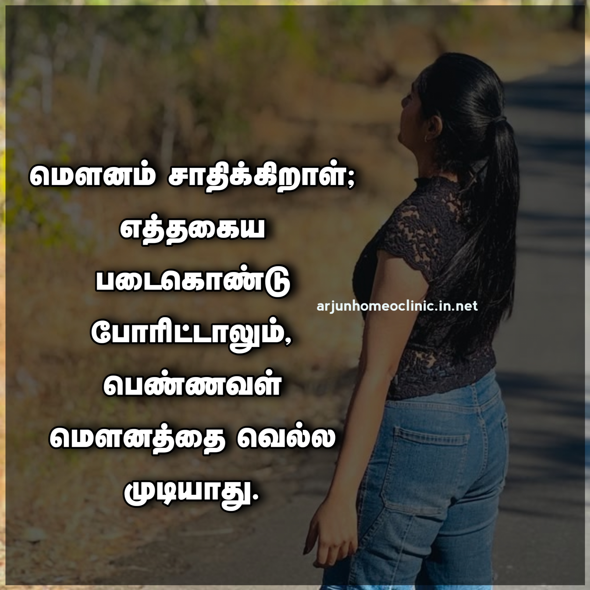 மௌனம் சாதிக்கிறாள்; எத்தகைய படைகொண்டு போரிட்டாலும், பெண்ணவள் மௌனத்தை வெல்ல முடியாது.